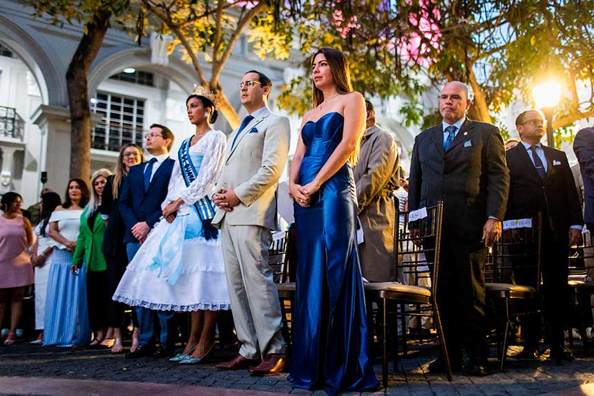Asimismo, se realizó el ofrecimiento formal del Faldellín a la ciudad, prenda tradicional utilizada por las damas guayaquileñas en la época independentista. “El faldellín es una prenda muy popular a finales de los 1700 y comienzos de 1800, por lo tanto, sería muy probable que las damas guayaquileñas que vivieron los hechos independentistas hayan lucido esta hermosa prenda. Con trajes blancos, cinturones, lazos y adornos celestes, los colores emblemáticos de la señal del nuevo estado”, destacó Fernando Mancero, presidente de la Fundación Bienvenido Guayaquil.